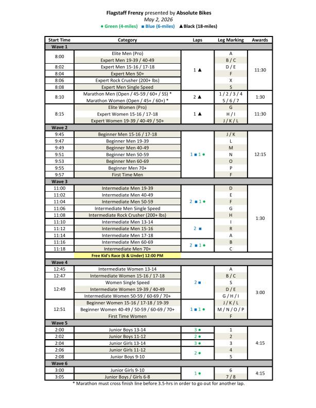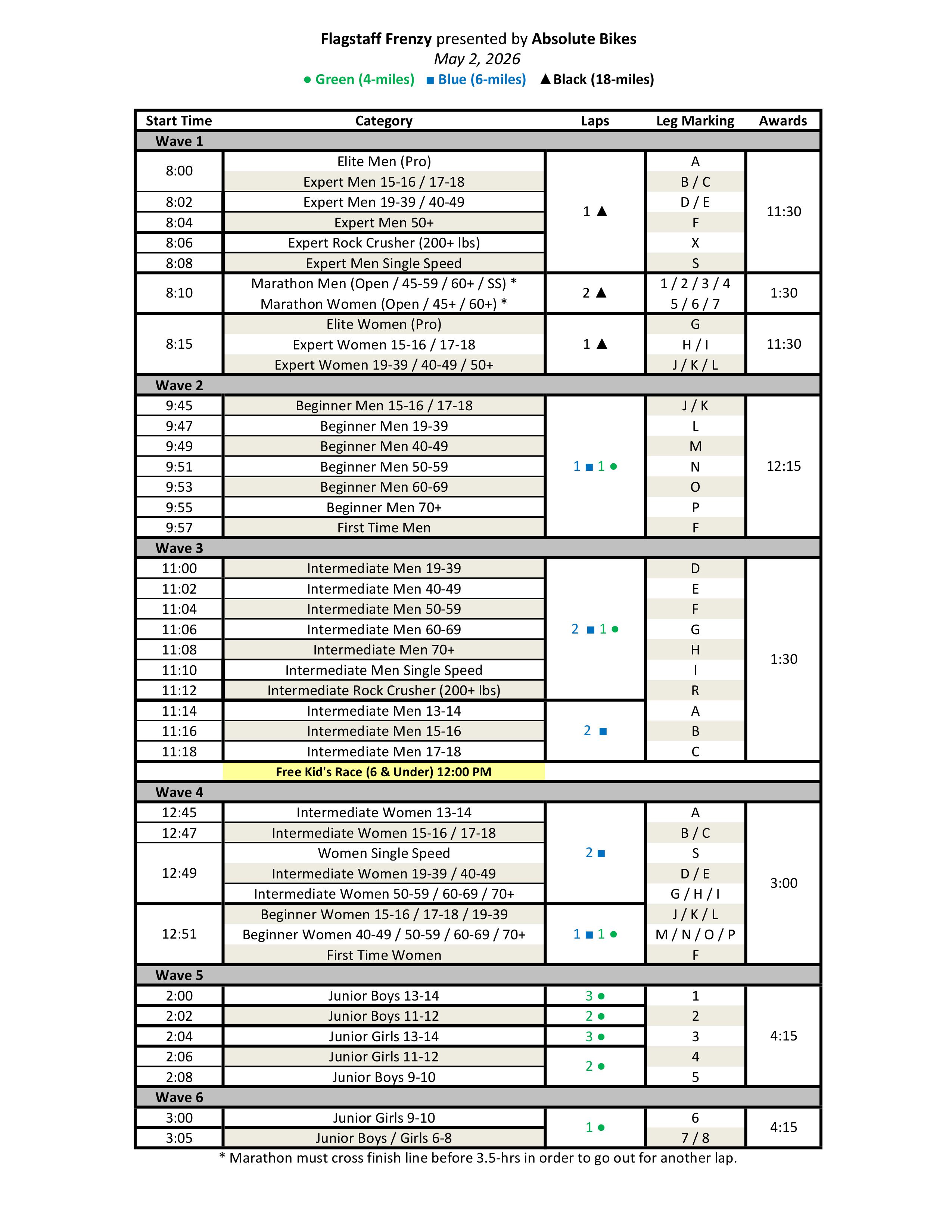 START TIMES & LAP COUNTS: